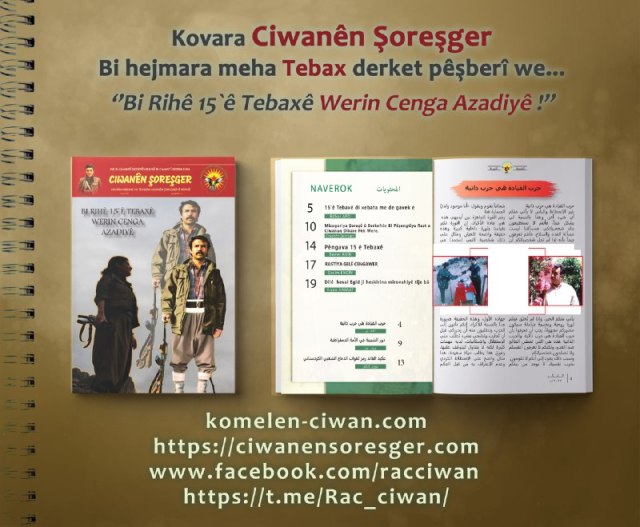 Kovara Tevgera Ciwanê Şoreşger bi hejmara meha pêngava dîrokî meha Tebaxê , bi şîara bi rihê serkeftina 15'ê Tebaxê werin cenga azadiyê li pêşberî weye .